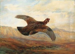 Red Grouse In Flight Over Moorland