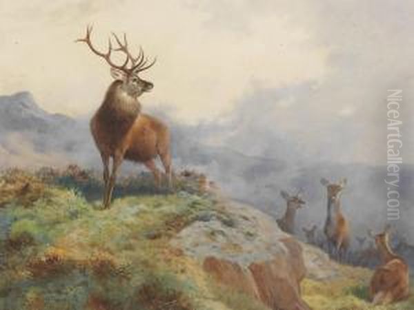 A Stag And Hinds In A Highland Landscape