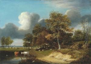 A River Landscape With A Shepherd With His Herd On A Path Conversing With A Woman