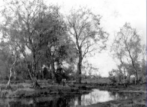 A Wooded Landscape With Ducks On A Bank And Cows In A Meadow In The Background