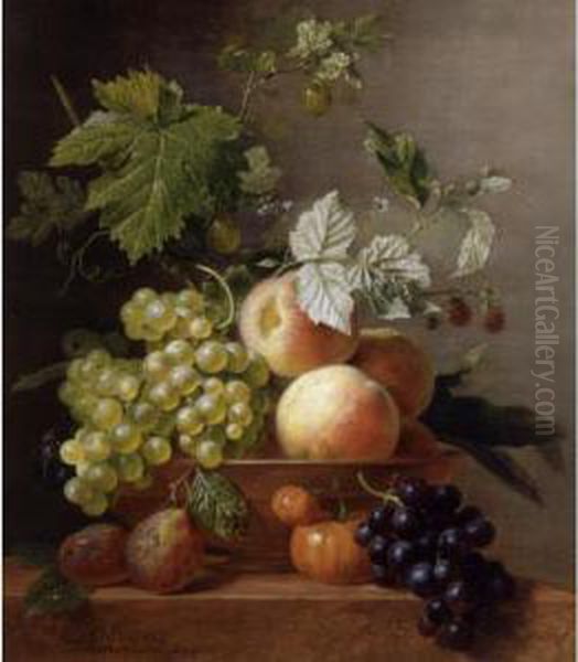 A Still Life Of Grapes And Peaches In A Bowl With Other Fruit, All Resting On A Ledge