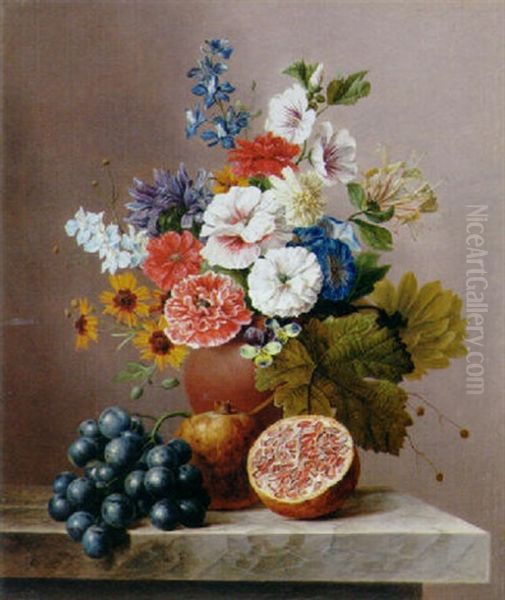 Flowers In A Vase With Grapes And Pomegranates On A Stone Ledge