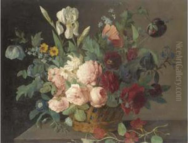 Roses, Narcissi, Irises, Tulips And Other Flowers In A Basket On Astone Ledge