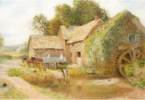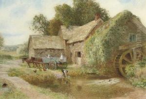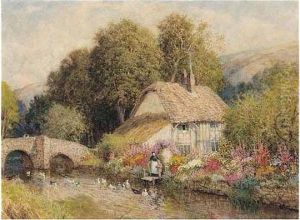 Maid Feeding Doves Before A Thatched Cottage; And Another, An Old Watermill, With Ducks