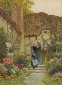 Cottage And Garden With Two Girls And Geese