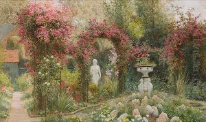 A Cottage Garden In Full Bloom With A Young Girl Standing By A Gate