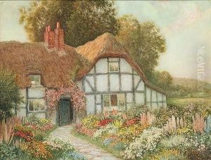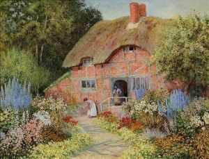 A Thatched Cottage With A Girl Feeding Pigeons By A Flower Bed In The Foreground