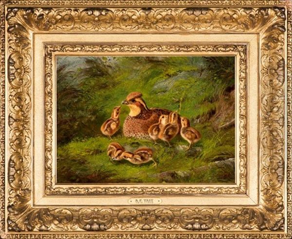 Hen Quail And Chickens Oil Painting by Arthur Fitzwilliam Tait