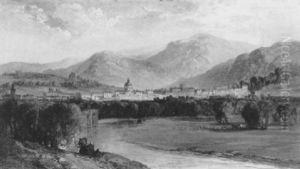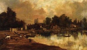 A Hay Cart Before A Thatched Village In A Rolling Wooded Landscape