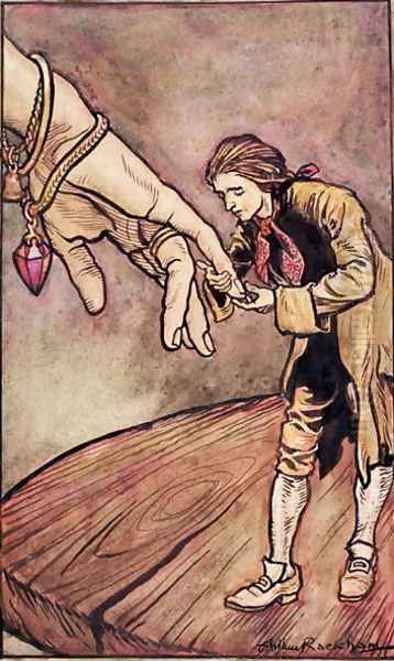 Bring the timeless beauty of Arthur Rackham's Original watercolour illustration for Gullivers Travels by Swift, Gulliver in Brobdingnag, 1909 into your home with a handmade oil painting reproduction. Carefully recreated on canvas by skilled artists using traditional techniques, this piece captures the delicate brushwork, subtle light, and vibrant color of the original masterpiece. With museum-level quality and rich texture, it brings elegance and artistic depth to any space. Enjoy free shipping and make this masterpiece a part of your personal collection.