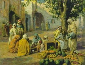 Arabischer Dorfplatz Mit Gemusehandler Und Schachspielern