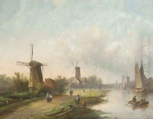 Dutch Coastal Scene With Boat And Figures In Foreground And Distant Windmill