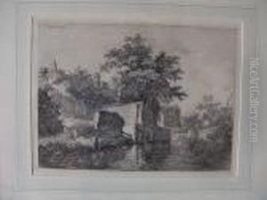 A Wooded Landscape With Cottages By A River And A Windmillbeyond