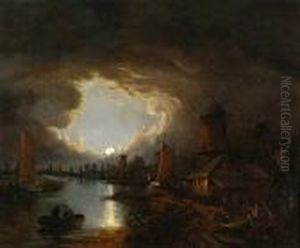 Boats And Windmills At Moonlight