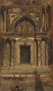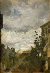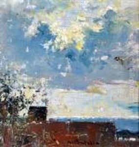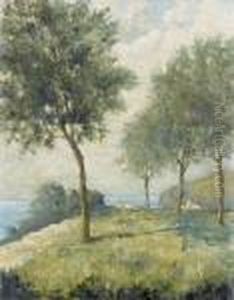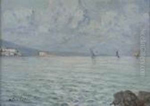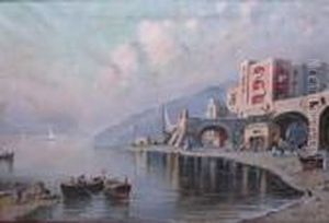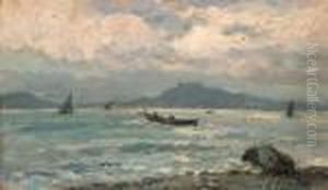 Veduta Costiera Con Figure Sulla Spiaggia E Barche Inmare