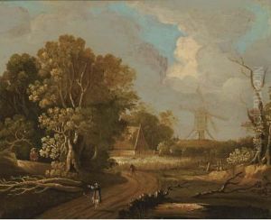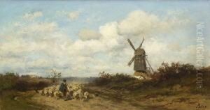 Troupeau Et Son Vacher Dans Un Paysage Au Moulin