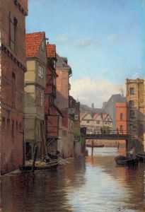 Tysk Bymotiv Med Kvinde Der Henter Vand I En Kanal