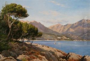 Bakket Landskab Med Udsigt Mod Vandet, En Kone Traekker Afsted Med Et Aesel