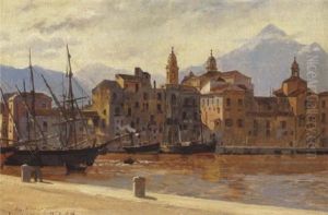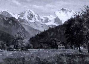 Bjergparti Fra Norditalien. I Forgrunden En Lille By Ved Flodbredden