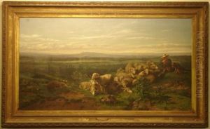 Berger Et Ses Moutons Dans Un Paysage Enneige