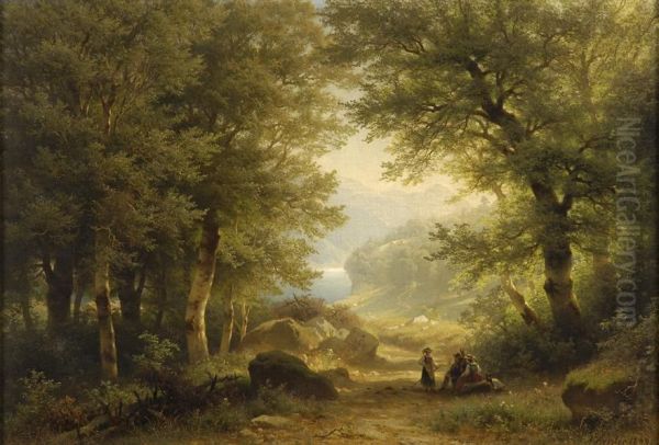 Bewaldete Seenlandschaft Mit Rastendem Landvolk.