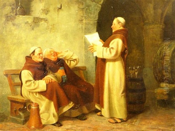 Monks In The Wine Cellar Discussing A Newspaper Article