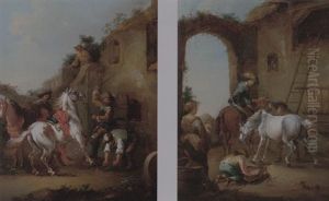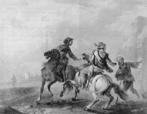 Bandits Watched By Two Horsemen, One Dismounted, On A Path In A Coastal Landscape
