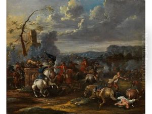 A Cavalry Skirmish; And A Cavalry Skirmish With Figures Firing From The Rooftop (pair)