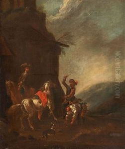A Horsetrader Displaying His Wares And A Peasant Feeding Horses By A Rocky Archway (pair)
