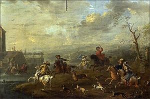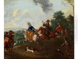 Zwei Reitende Jager Mit Falken, Diener Und Hunden