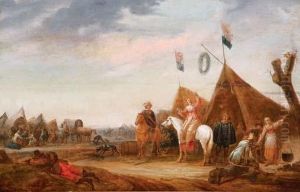 Soldiers And Horsemen Halted And Resting At A Military Encampment