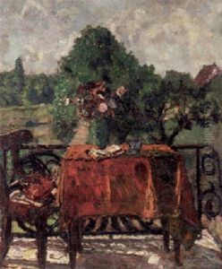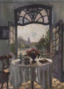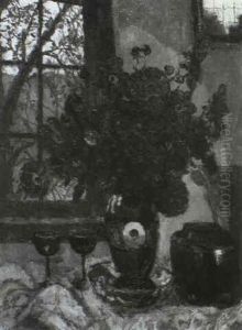 Interieur Mit Blumenvase Auf Einem Rotgedeckten Tisch