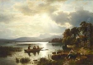 A Lake Surrounded By Mountains With Figures In A Rowing-boat