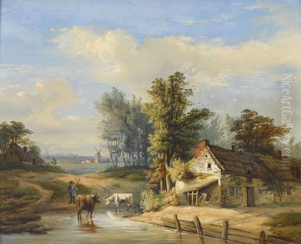 Bauer Mit Kuhen Bei Furt Und Gehoft.