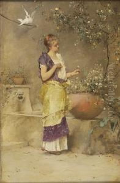 Girl Picking Daisies While A Pair Of Doves Sit On A Branch Above Her Head. Signed Middle Left.