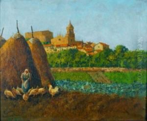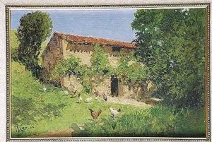 Paisaje Con Campesino Y Gallinas.