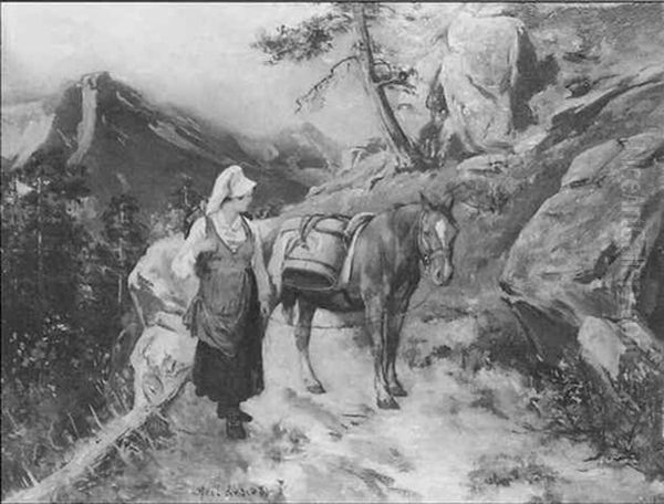 Woman With A Pack Horse On A Mountain Path