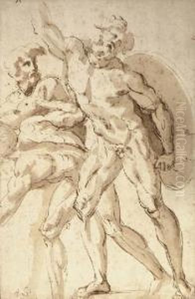 A Nude Warrior With A Shield Reaching Up To The Left, Two Crouching Nudes To The Left