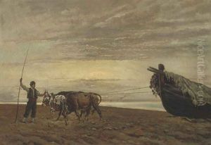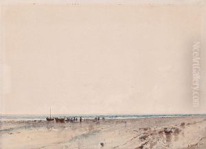 Children Playing Cards On A Beach, The Bay Of Naples And Vesuvius Beyond