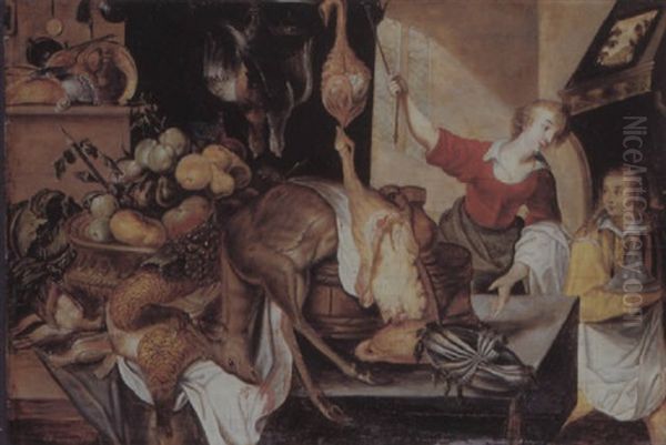 A Kitchen Interior With Two Servants Beside A Table Draped With Dead Game And A Basket Of Fruit