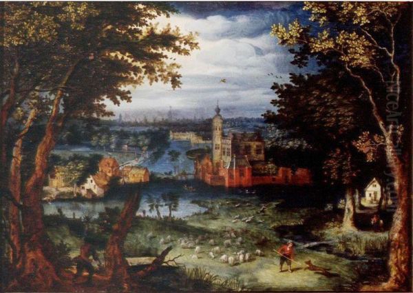 A Wooded River Landscape With A Manor House By A Village, A City Beyond