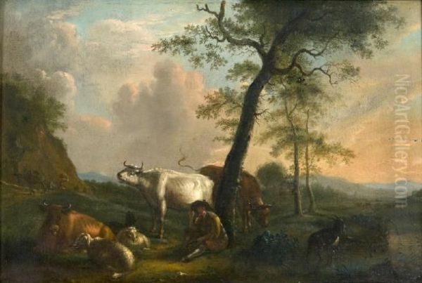 A Herdsman Resting With Cattle