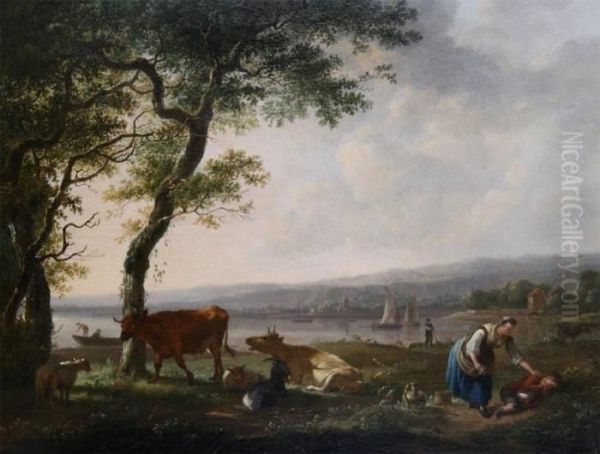 River Landscape With Shepherdess And Sleaping Child