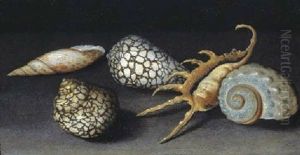A Still Life Of Flowers With Some Shells Arranged On A Ledge