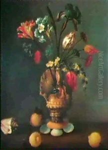 Fruit On A Dish, Flowers In A Vase, And Other Objects On A Stone Ledge