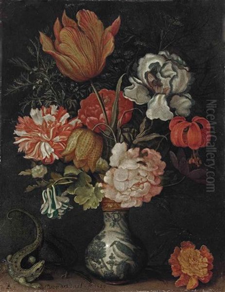 A Tulip, Iris, Rose, Fritillary, Martagon, And Carnation In A Wan-li Vase, On A Ledge With A Lizard And A Dragonfly