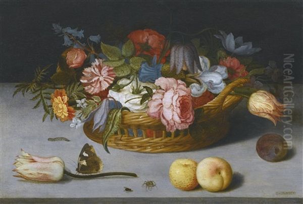 Still Life With Roses, Tulips, Irises And Other Flowers In A Wicker Basket, With Fruit And Insects On A Ledge Oil Painting - Balthasar Van Der Ast