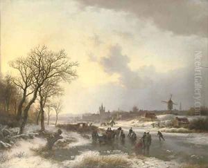 A Winter Landscape With Skaters And Figures By A Horse Sledge On The Ice