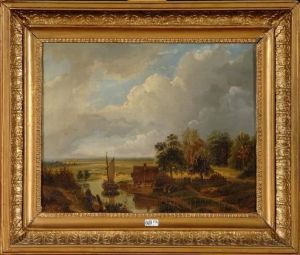 Niederrheinische Flusslandschaft Mit Kleiner Ortschaft Und Personenstaffage