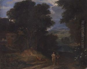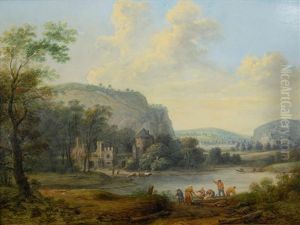 Figures And Cattle On A Path In Wooded Landscape With A Castlebeyond